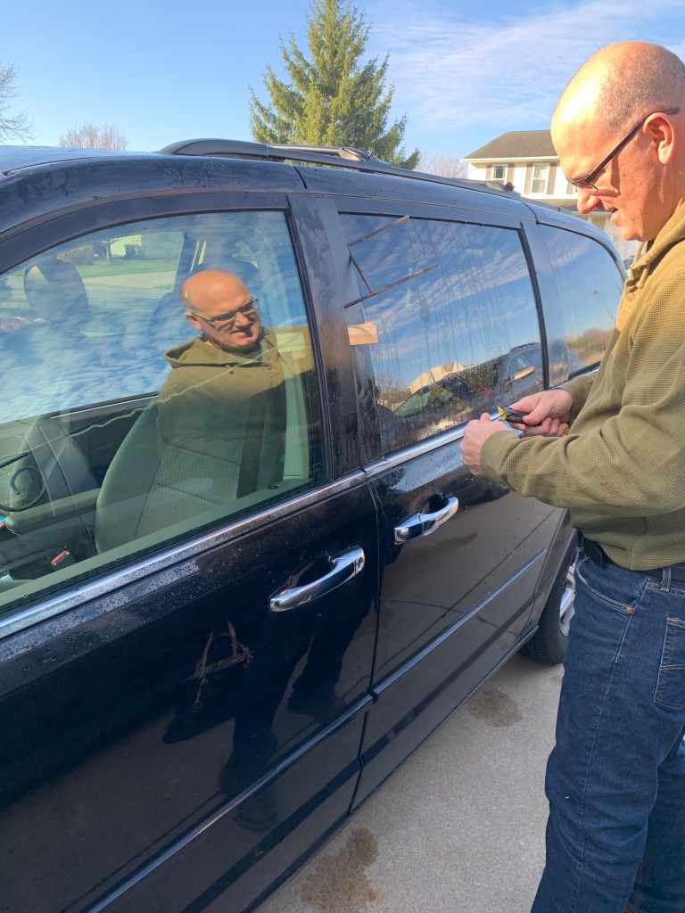 This morning was a bit chilly. Chuck started my car while I was getting ready. I decided I would take the van to get mom today. It’s easier for her to get in and out of, and her walker is still in the back of it. I was right on time. I headed out the door and walked up to my van. It was running and the heat was blowing. The only problem was that the doors were locked, with the keys in it.