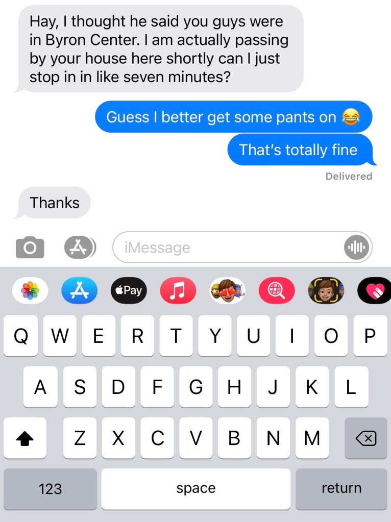 Right off the bat I got a call from Sam. Sam is the excavator that is going to be doing the prep for the new patio. As of 8:30 this morning I had never met him. I don’t normally answer random number calls but this one appeared to be localish, and my caffeine hadn’t fully kicked in yet. Sam told me he’d swing by around noon to take a look at the space and asked my if I could text him my address. As you can see by our text conversation, I had another lack of filter moment. Thank goodness when Sam showed up he had a good sense of humor because that could have been hella awkward.