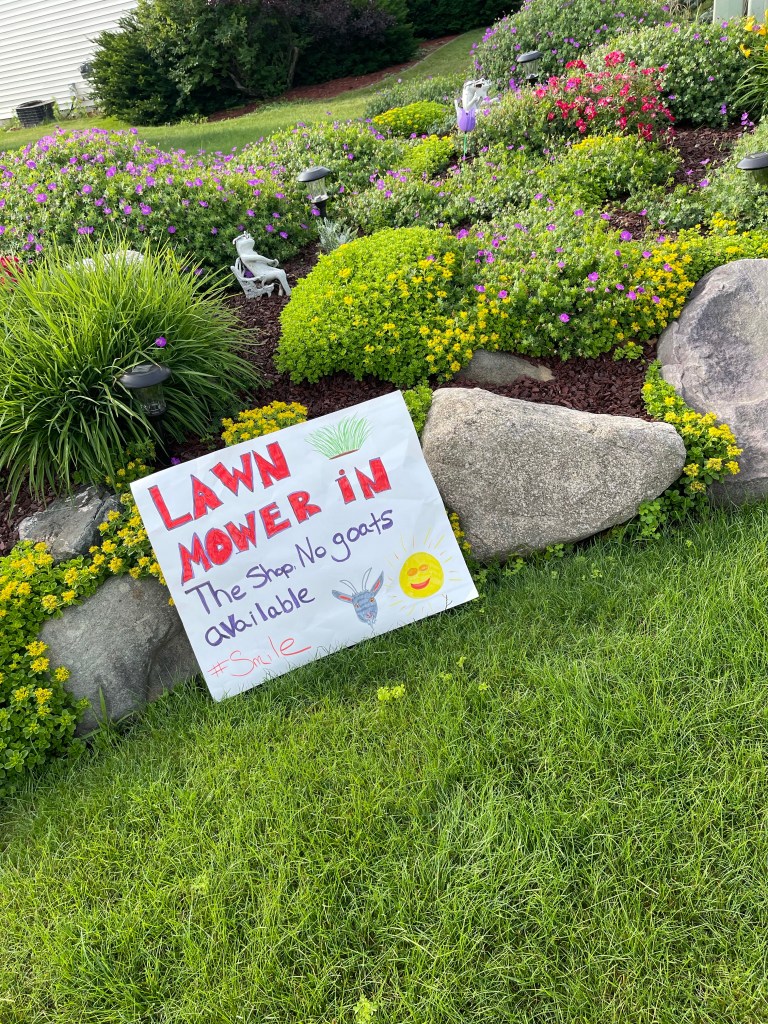 Our lawn mower is in the shop. It’s been there for a week and my yard is getting a wee bit outta control. While I was killing time waiting to pick Brogan up from football this morning, I got a bit creative. I’m actually very impressed with my free handed goat. I thought I’d let my neighbors now that we aren’t just lazy. There’s an actual reason our yard is more than likely breaking every HOA rule. Again I thought it was funny as hell.
