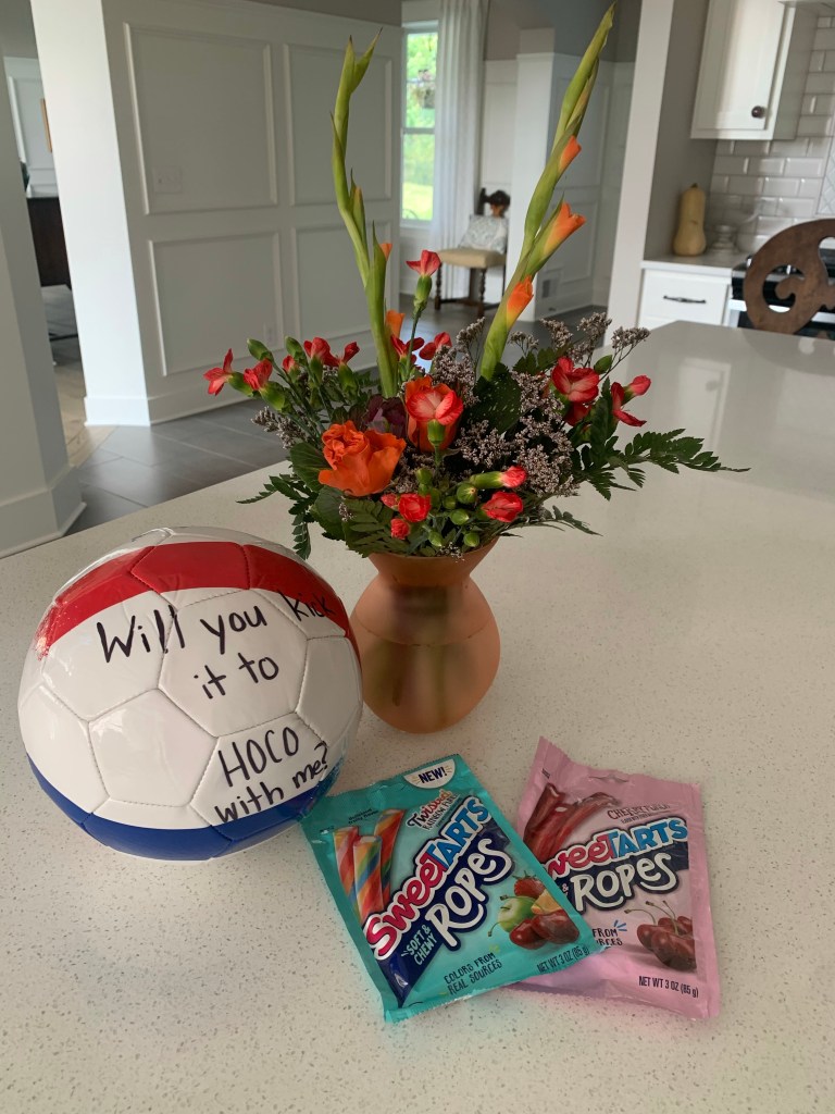 Imagine this quarantine during homecoming proposals. Yeah, homecoming proposals are a thing. Brogan has been throwing around so many ideas, but executing them seems almost impossible. None of us are going anywhere or getting anything. He called his big sister. She knows we are quarantined and she stepped up and delivered. He told her what he wanted and she included him on every decision. They were actually on FaceTime so he could pick out the candy, soccer ball and the flowers.