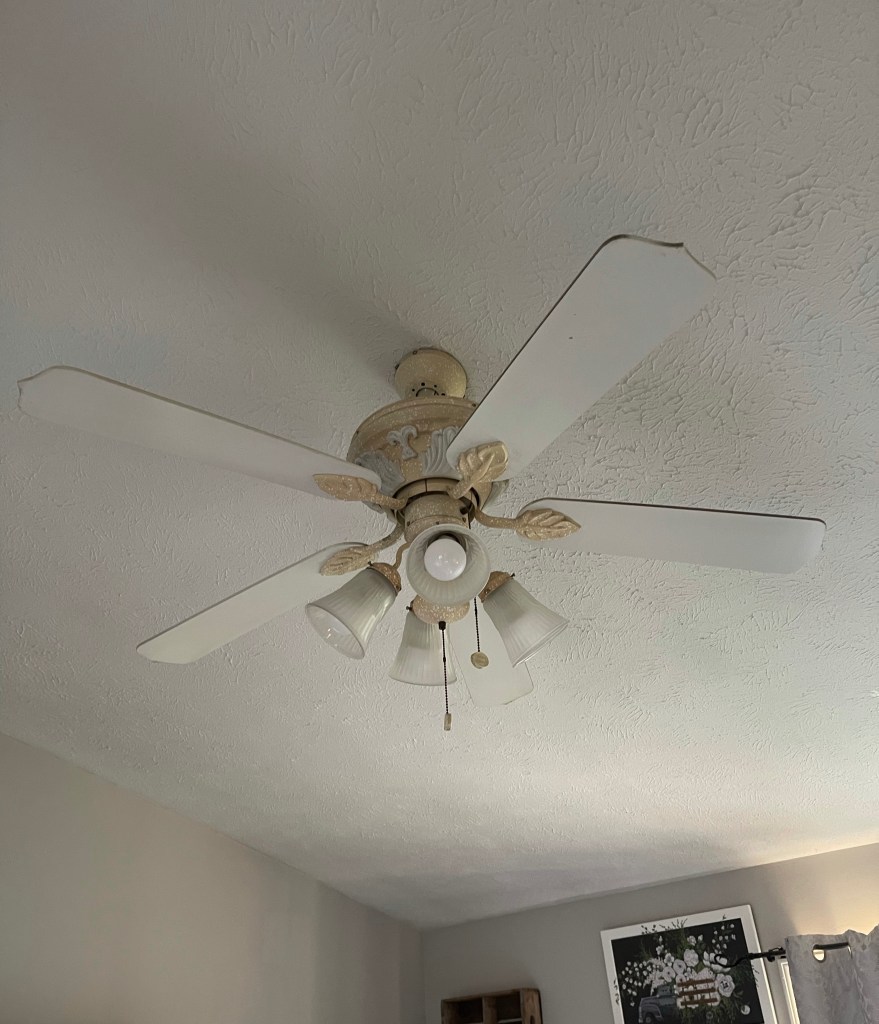 The first step was taking off the old glass globes. I’ve got a Halloween idea for those, but I’m gonna wait a bit. Then the fan blades came off. Holy smokes there was actually a grey grain side. I didn’t love it, so I ended up painting it anyway. Then the main fan.