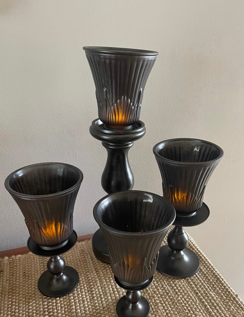 Remember when we redid our ceiling fan? Well I repurposed those old ugly glass globes. I made Halloween candle holders. I’m in love with the outcome. It was an incredibly easy project.