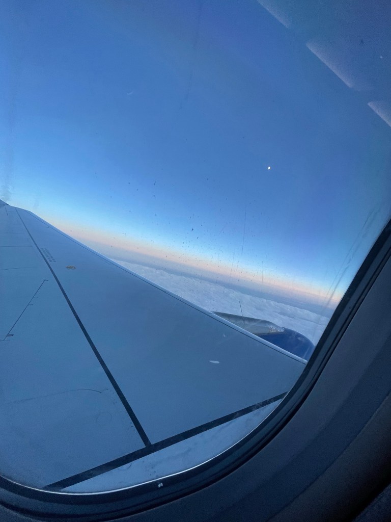 We boarded the plane and Chuck and I were seated across the isle from each other. There was some sort of mechanical problem but they got it fixed. The snow that we got, delayed us a bit more due to the de icing. The flight once we got going was pretty uneventful.