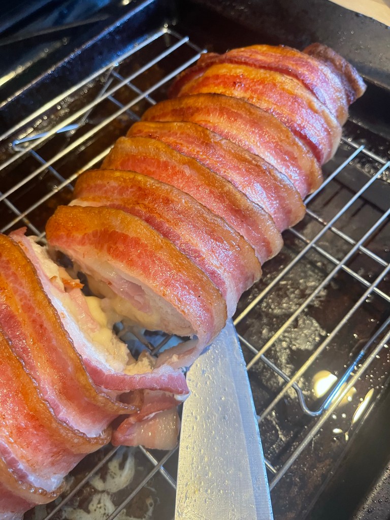 I got a wild hair to try and cook something new for dinner on Sunday. Chuck and Brogan were at baseball practice from 12-3 so I had plenty of time to make Chicken Cordon Blue. Let me just say, it looked devine. It’s tasted like shit, but it looked good. I don’t know what I did wrong. I followed the directions to a T. It was bland with no flavor. Here’s a picture of my beautiful loaf of wasted chicken breasts and bacon.