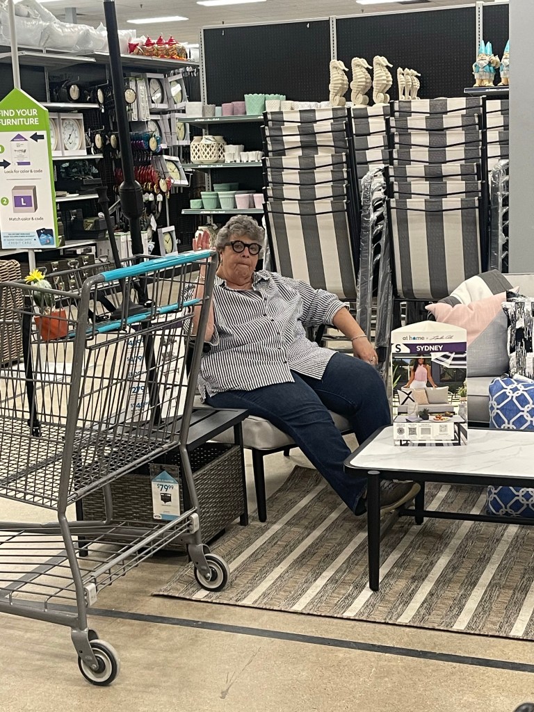 Saturday I took my mom to At Home. I needed some stuff for my bathroom. The 2 month remodel is almost done. I have a mirror project to finish and some final decorative touches but other than that, it’s done. My moms a good sport. We split up to shop. When she gets tired she will find a place to rest. I came around the corner and there she was. Sitting on the patio furniture display and she had run into 2 of her friends. I laughed so hard. They were adorable. All sitting there just chatting. I’m thankful for the friendships that she has.