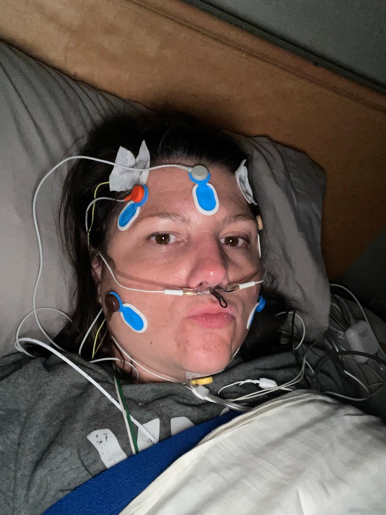 Kim took alcohol swabs and started cleaning random places. She explained that she was going to stick multiple electrodes to my face, head, chest, and legs. What she didn’t tell me is how bad that was gonna suck. They didn’t hurt. They were awkward and I felt like Pinocchio all night. I’d move my leg and my head would pull. I’m not abnormally tall but I swear those leads where intended for someone closer to 4ft tall.