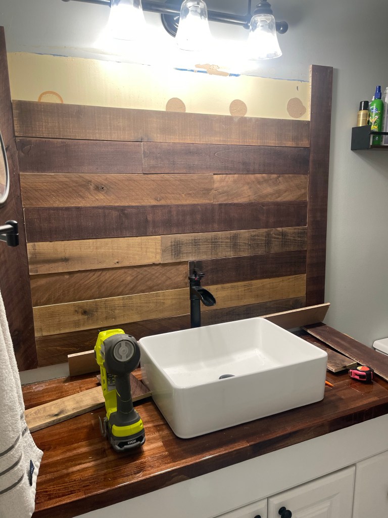 I knew that once that mirror came off it was going to be a mess behind it. I decided that I would just shiplap wherever there was damage. It would be about a 4ft x 3ft area. Easy peasy. After 2 trips to Home Depot I got some wood slats that would work.